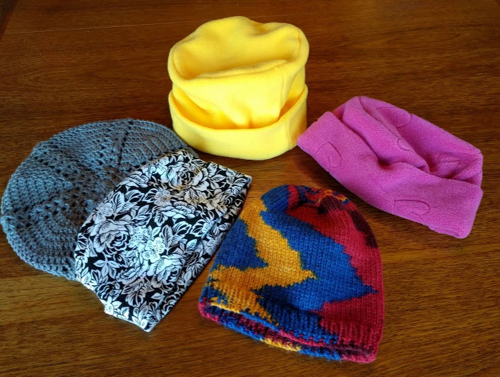 Knit and crochet hats are also welcome, especially adult size. www.ravelry.com has 623 free patterns for chemo caps made of yarn.