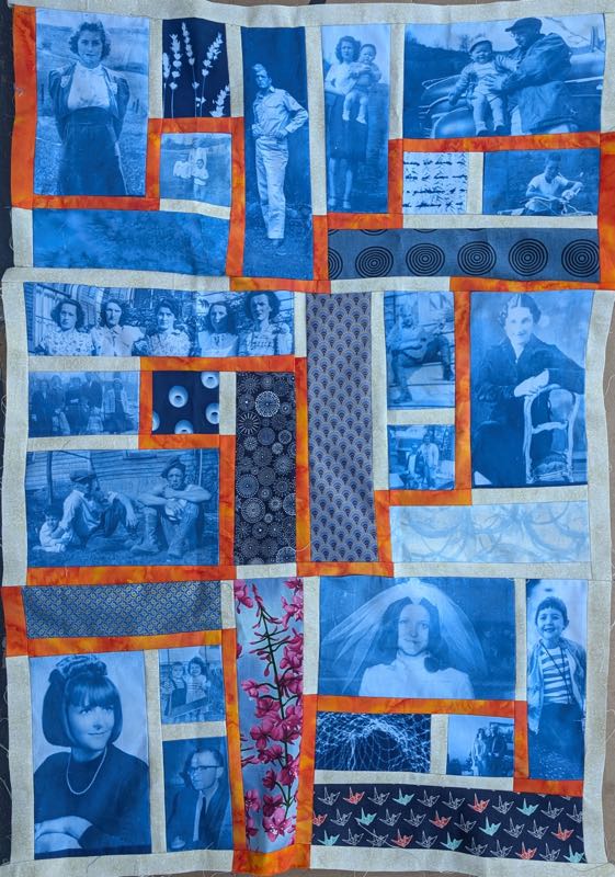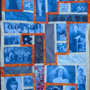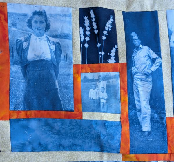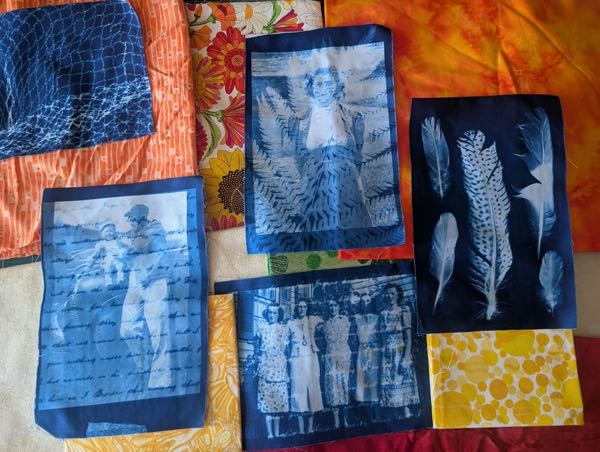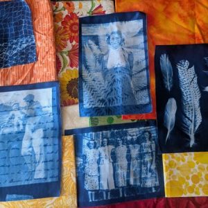 Cyanotype creates beautiful blue and white prints using UV radiation (the sun) and the shadows of objects like leaves, lace, keys, small trinkets, or large format negatives such as photographs. It is an easy to learn and fun process that brings creativity and your own special magic to quilting projects.