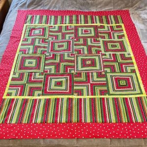 This can be a baby quilt or a wall hanging. There is the option to make it bigger. All you need is a striped fabric and a border fabric (or two). The most difficult part is actually finding a striped fabric you like. Although a fabric with regularly spaced lines will work just fine. Try to find a fabric with irregular stripes. The amount of fabric listed will yield 16 blocks. There are 2 different blocks. You can add applique’ or replace some blocks with other designs. The possibilities are only limited by your imagination!