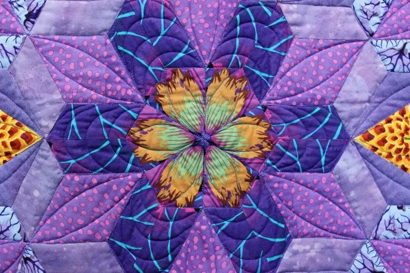 "The New Hexagon Milliefiore" close-up; pieced and track machine quilted by Ruth Mickelson. 2nd place Large Pieced by One