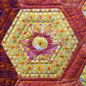 "The New Hexagon Milliefiore" close-up ; pieced and track machine quilted by Ruth Mickelson. 2nd place Large Pieced by One