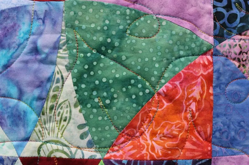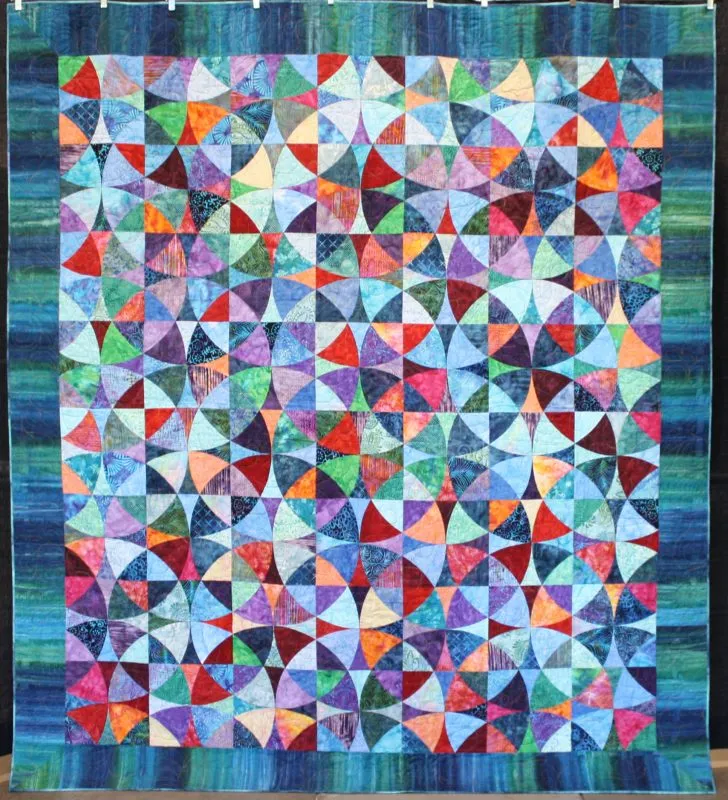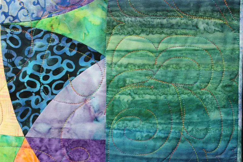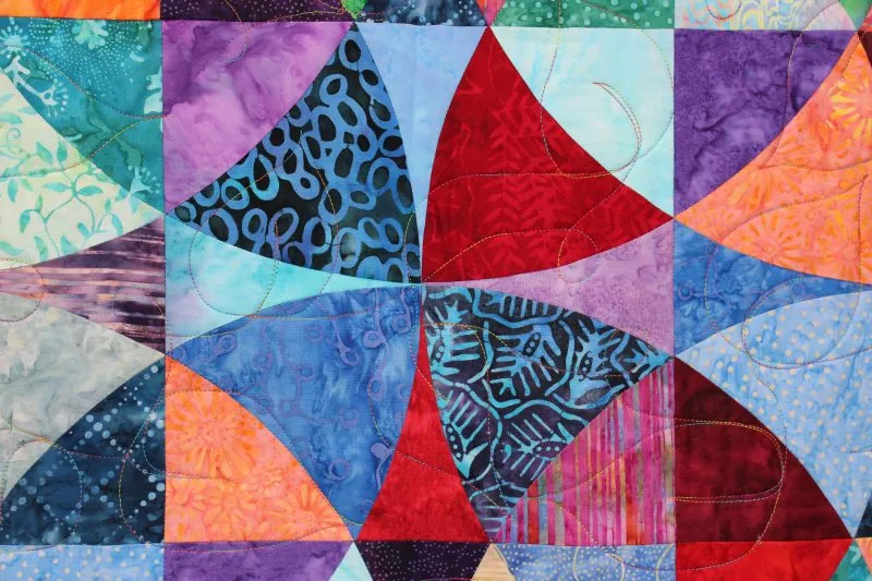 "Wheel of Mystery Rainbow" close-up; pieced and machine track quilted by Carol Johnston. 3rd Place in Large Pieced by One.