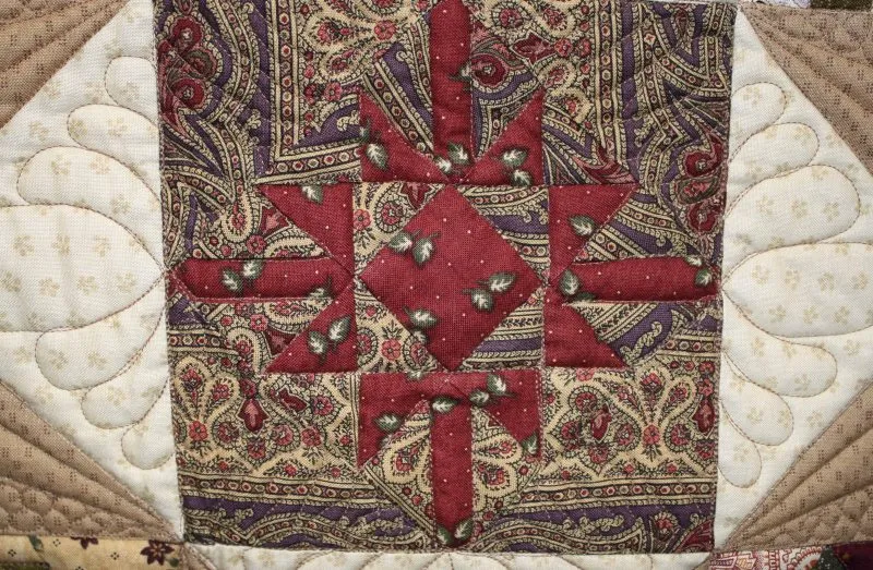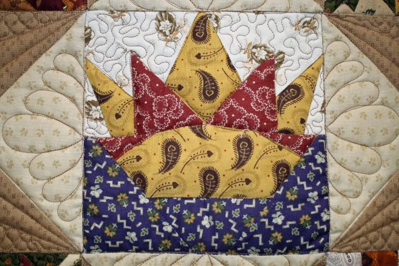 "JoAnn's Sampler" close-up; pieced by Janis Harrold; track machine quilted by Stephanie Collins. 3rd Place Large Pieced by Two or More.