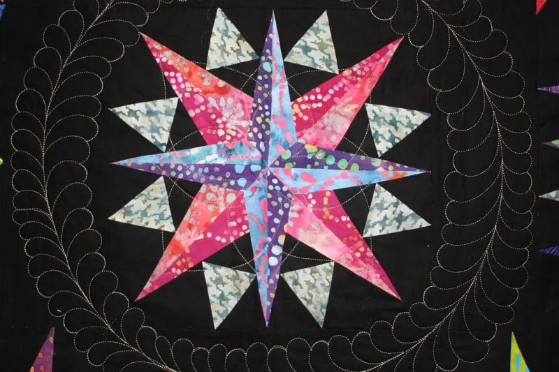 "State & Country Stars" close-up; pieced by Sandy Wyngaard; track machine quilted by Ellen Youngling. 2nd Place Large Pieced by Two or More.