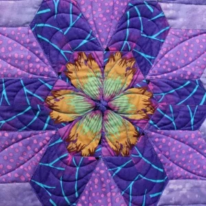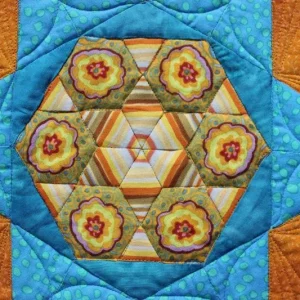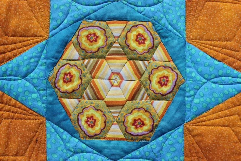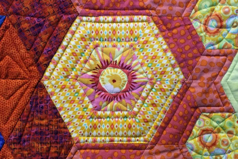 "The New Hexagon Milliefiore" close-up ; pieced and track machine quilted by Ruth Mickelson. 2nd place Large Pieced by One