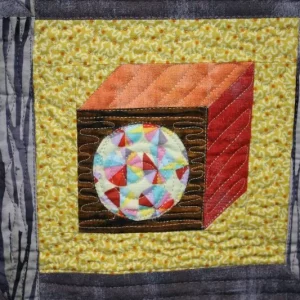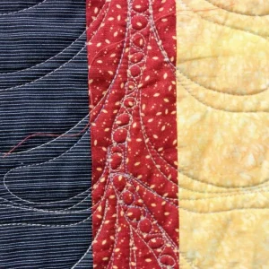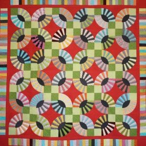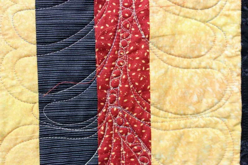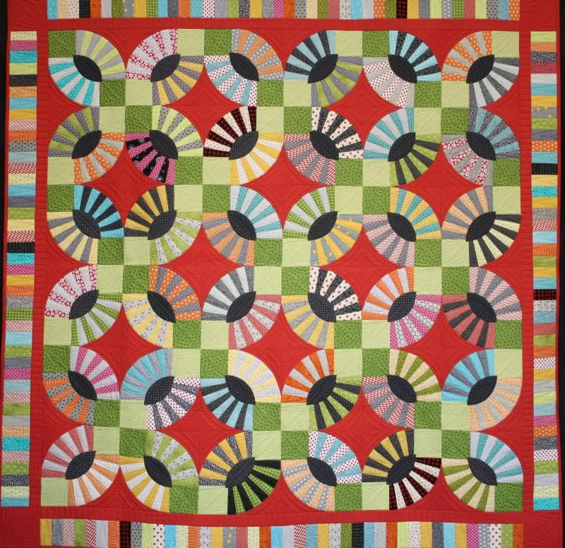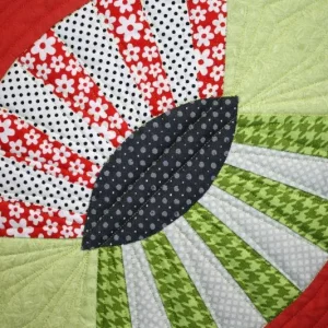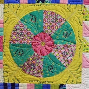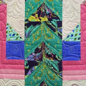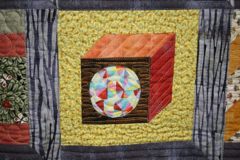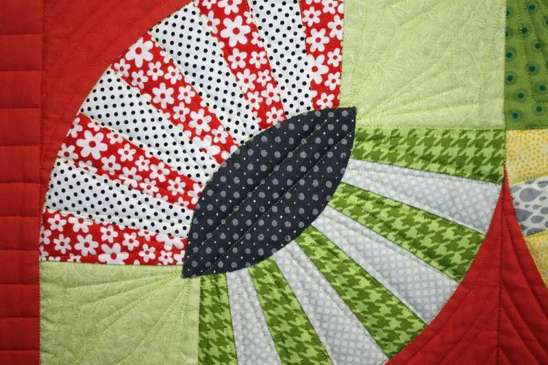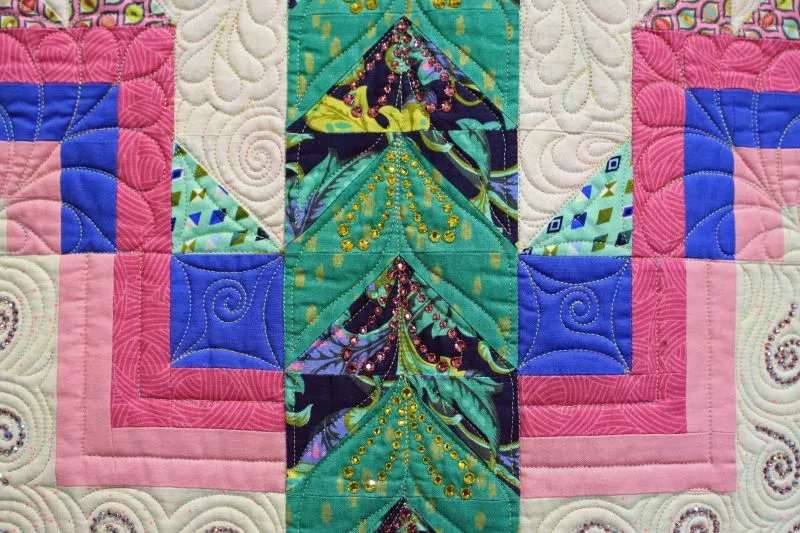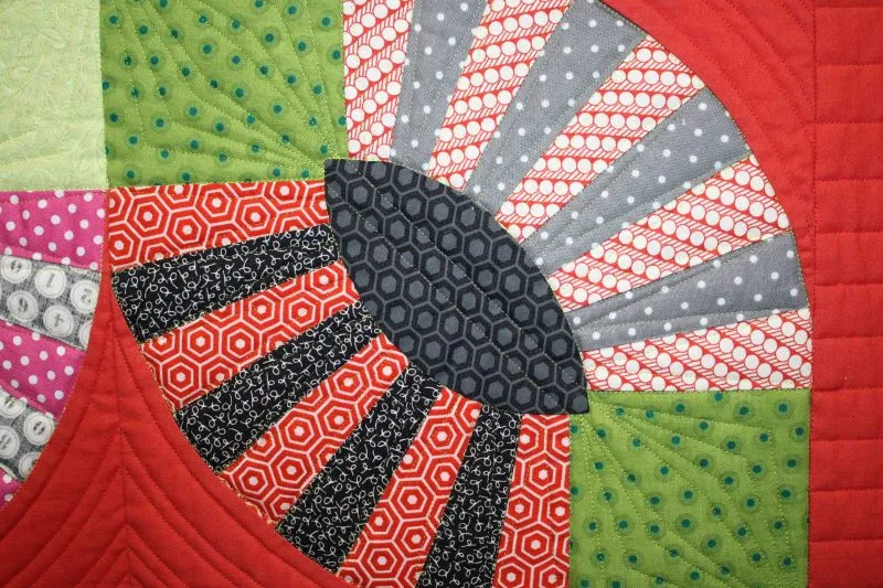 "Grandma Ida's Eye-Popping Pickle Dish" close-up; pieced by Nancy Christensen; track machine quilted by Cory Allender. 2nd Place Medium Pieced by Two or More.