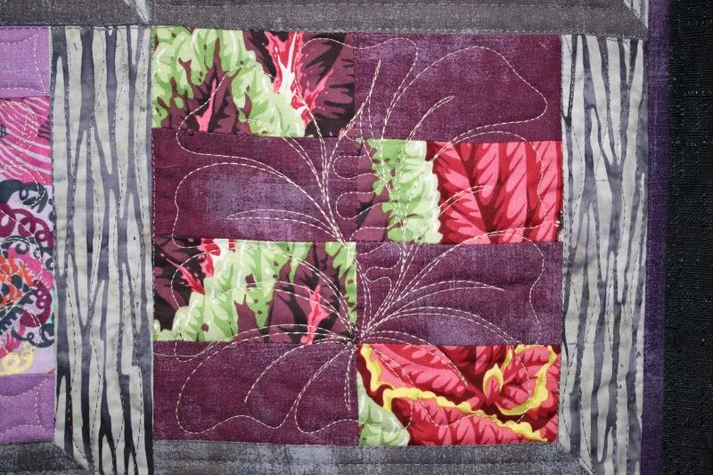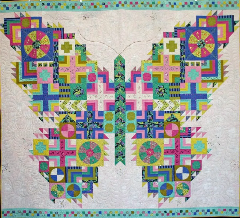 "Butterflies are Self-Propelled Flowers" close-up; pieced bu Susan Lavender; track machine quilted by Cynthia Fuelling; 1st Place Medium Pieced by Two or More. 2nd Viewers' Choice.