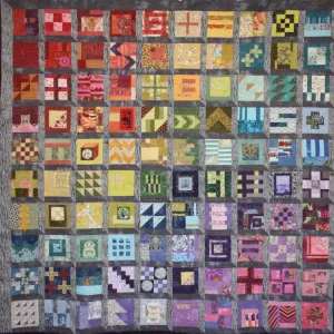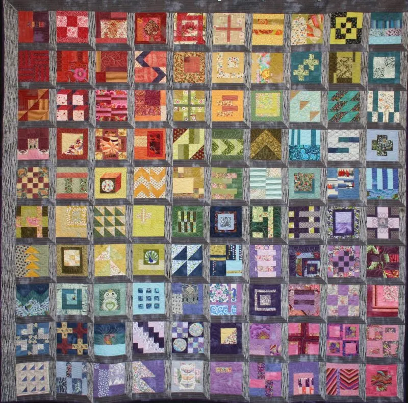 3rd Place - Medium Pieced by 2 or more. "100 Blocks in 100 Days" by Patty Henry; quilted on a track machine by Yvette Ebaugh.