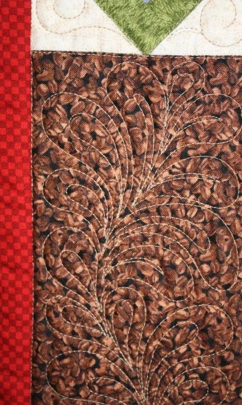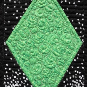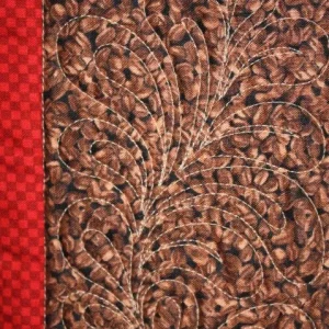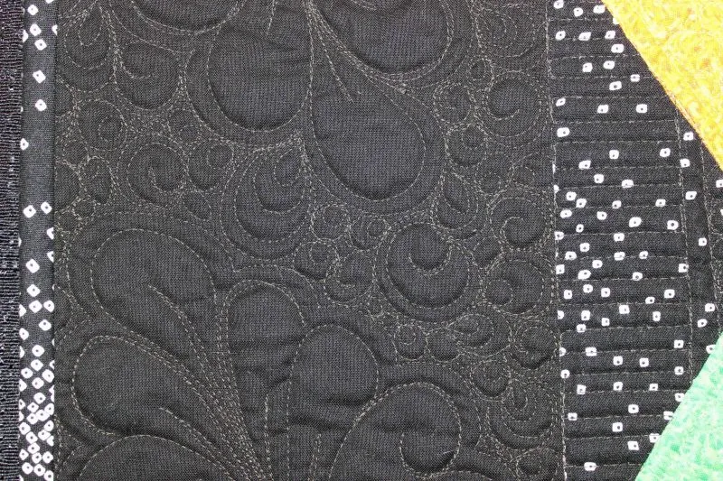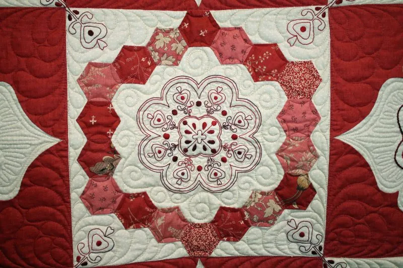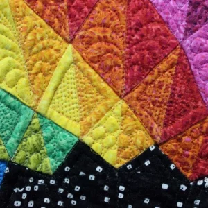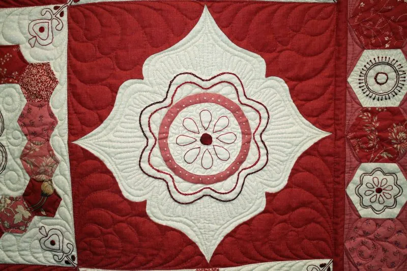 "Cornelian" close-up; pieced by Penny Andrew; track machine quilted by Yvette Ebaugh. 1st Place Mixed Technique by Two or More. Barbara Kantola Award. 3rd Viewers' Choice