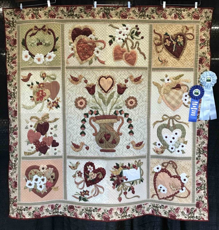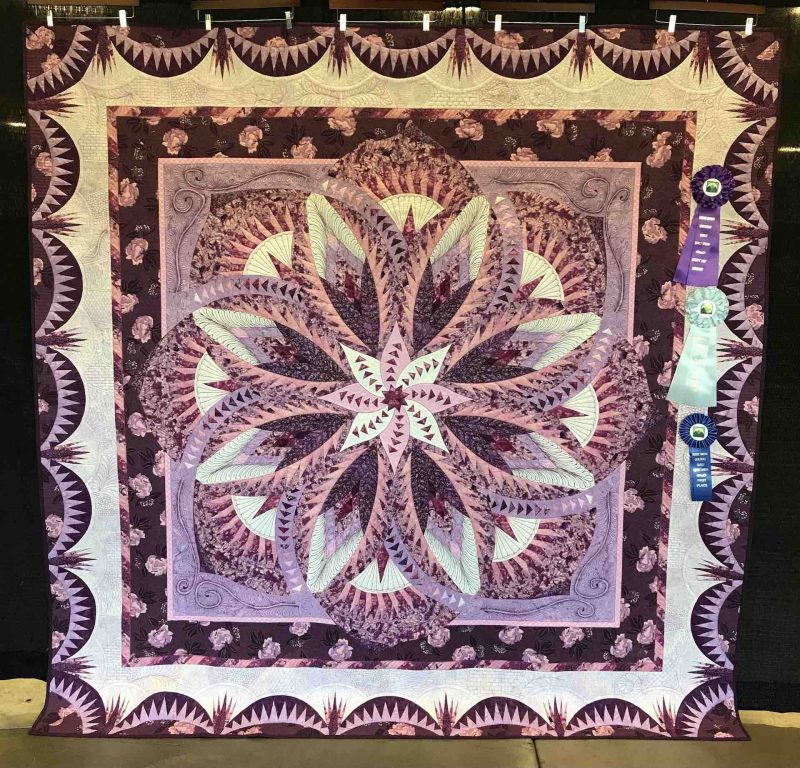 BEST OF SHOW- Large Pieced by Two or More-Best Track_Longarm Freemotion Quilting-Vintage Rose- Jan Paniogue-Quilted By Linda Carlson-