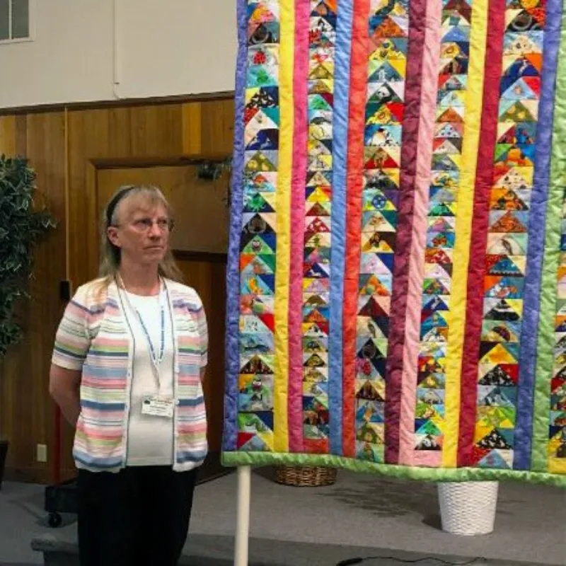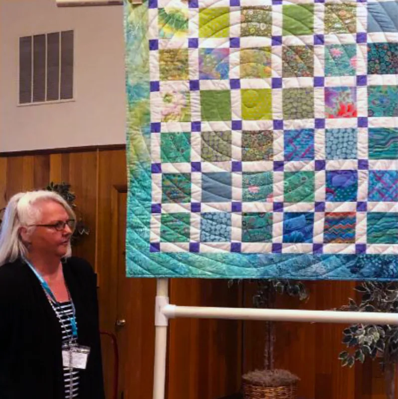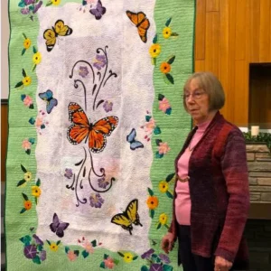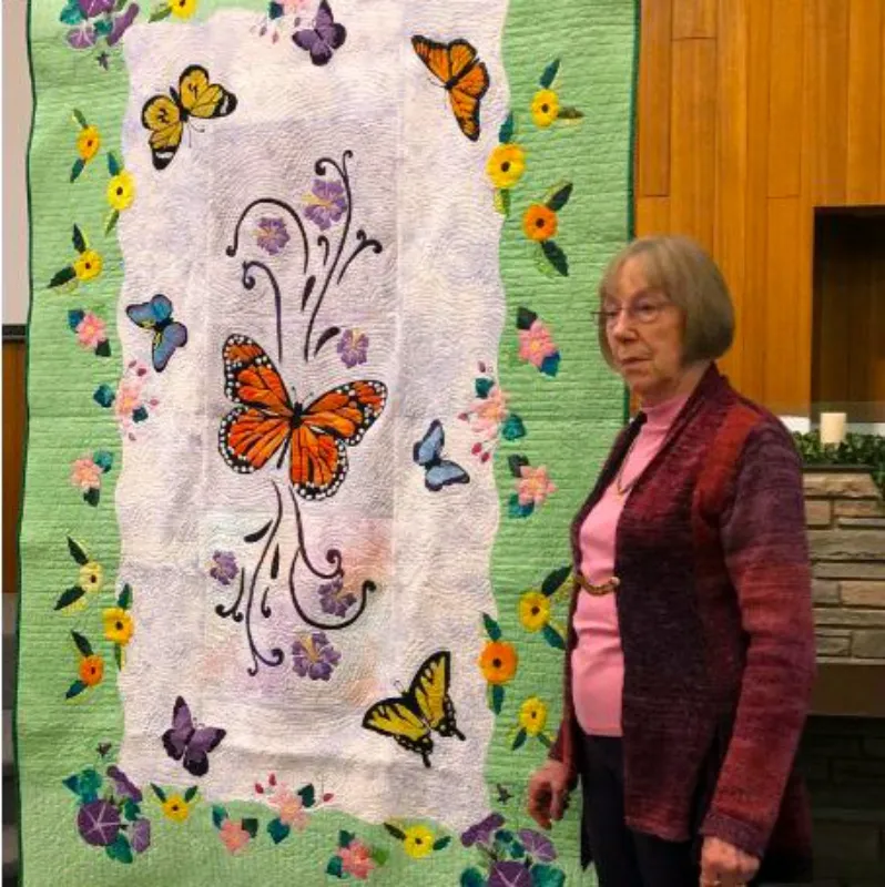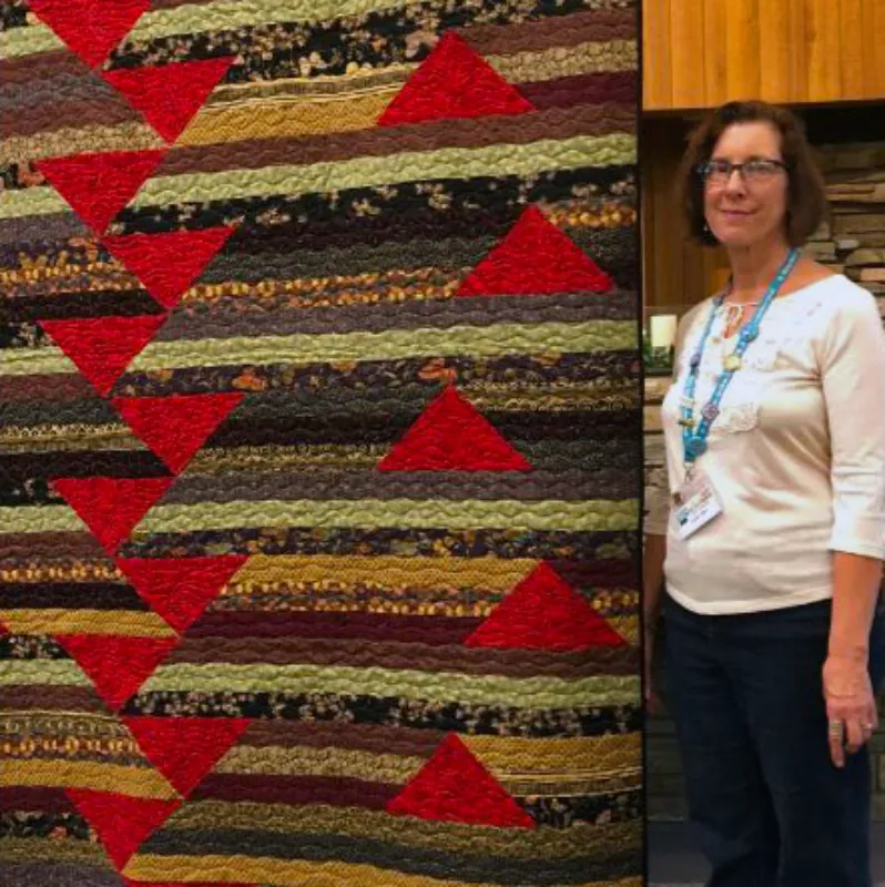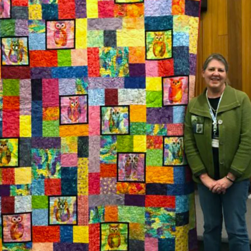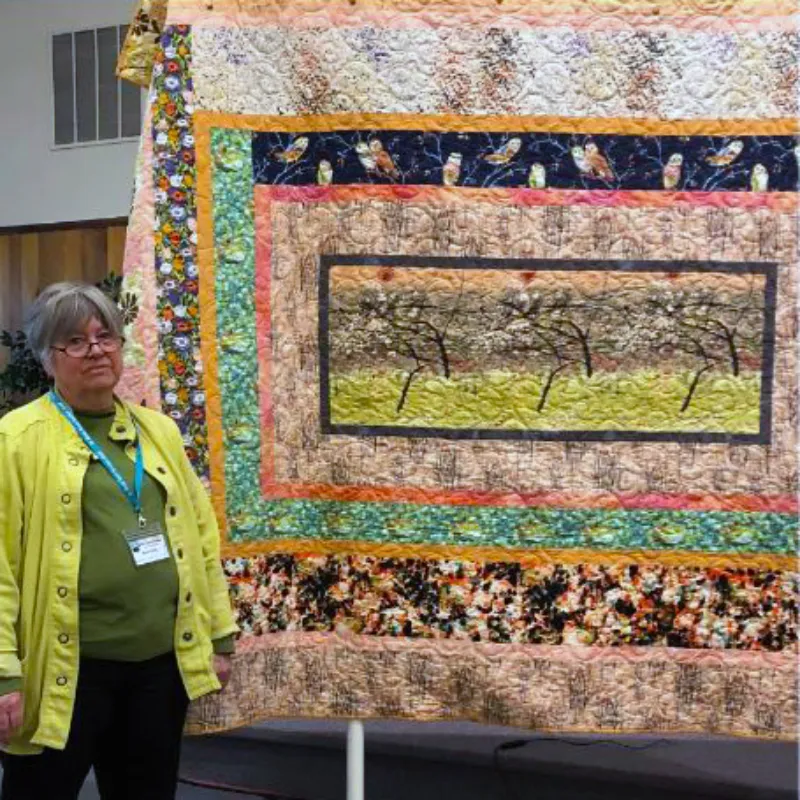 Jan Lundine was inspired to make her quilt by the sound of several Great Horned Owls. She designed it and this was the first time she used free motion quilting on a long arm. It is a birthday present for her husband.