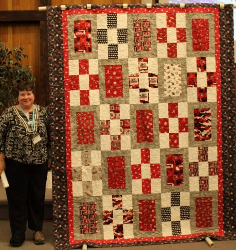 Roll Tide by CJ Adams. This is a gift for my father, a die-hard Alabama Crimson Tide superfan! A Facebook friend donated many Alabama fabric scraps. I designed both the quilt pattern and the pantograph pattern to quilt it.