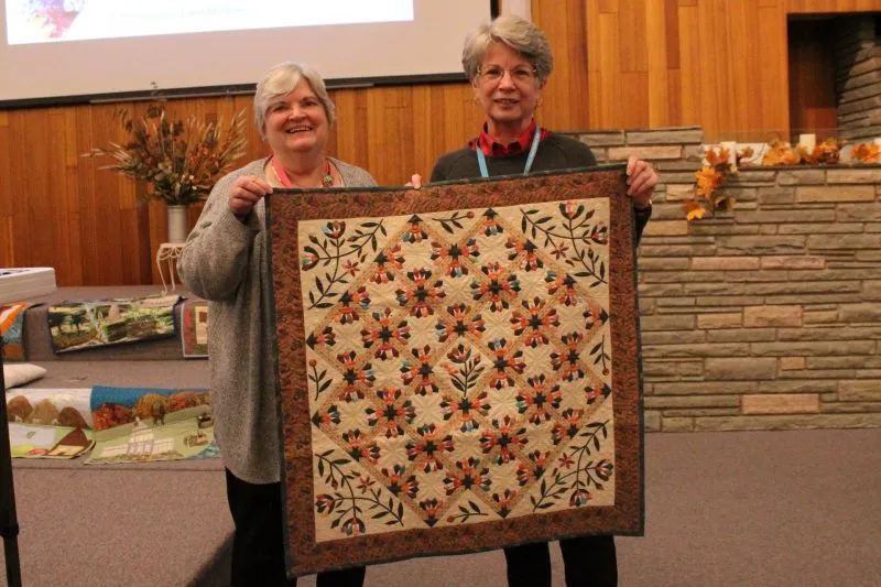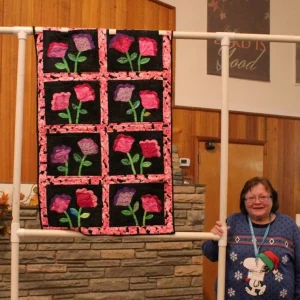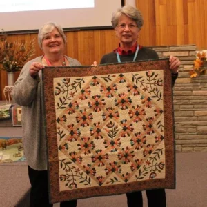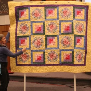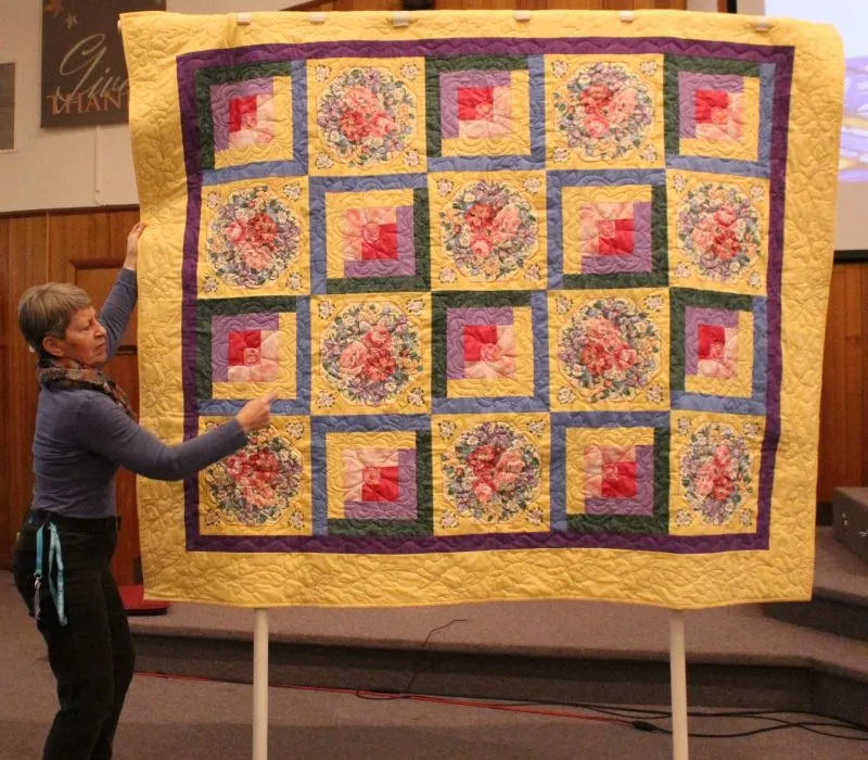 Floral Find by Donna Swanson. The floral fabric was found in a Garden Valley store and used matching fabrics from her stash. Quilt will be donated to a Young Life leader in Central Asia.