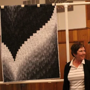 Stripes and Strips by Gwen Smith. This quilt is a result of a class at QuiltCon several years ago to use up some of my stash. PS. Also, just tonight, I finished the dress I'm wearing (started 5 yeas ago!)