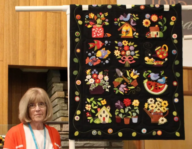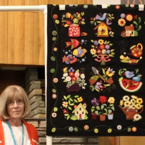 "Summertime Sampler" was made and quilted by Barb Williams from a pattern of the same name by Erica Kaprow. The top is all wool and the back and binding is cotton. It took a while to find the variety of wool used and about a year to complete the quilt.