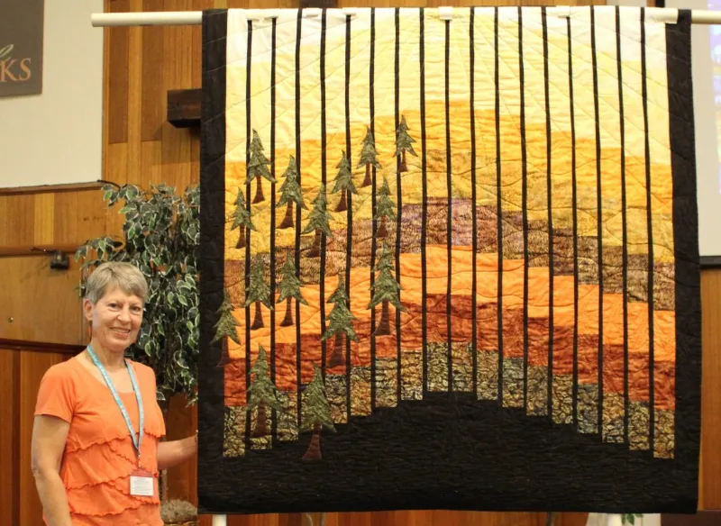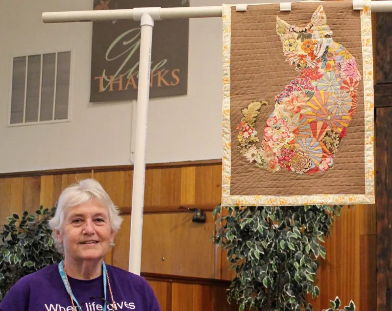 Deb Smith made her Cat Quilt at a collage class at Quilt Expressions. It was the first time she had made a collage quilt, ever used a walking foot and first time she tried to quilt. It looks great Deb!