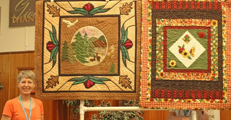 Donna Swanson made this Fall Quilt and quilted it on her long arm. She purchased it as a kit at a quilt shop in Mt. Vernon, Ohio. Every fall, her husband helps hang it in their living area.