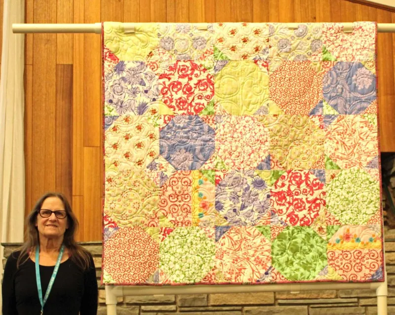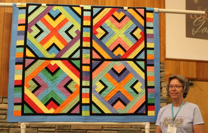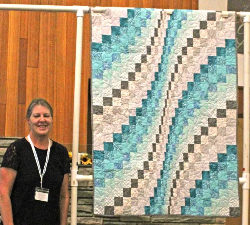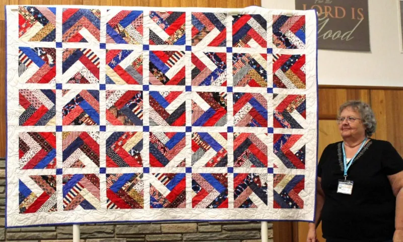 Sharon Koelling made and quilted this braided Quilt of Valor. She loves making braids after piecing 180 inches of braid, she cut it into 10" squares for this quilt. She has 2 more similar tops at home ready for her to quilt.