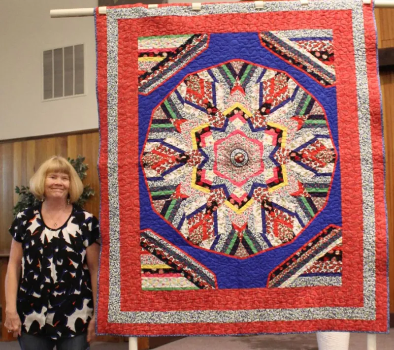 Janet Moats made "Fruit is My Candy" after going to the Star Valley Quilt Show and an 8 hr training from Ricky Tims. She didn't use his exact kaleidoscope pattern but did follow his technique. Most of the quilt is in 15 year old fabric featuring various fruits.