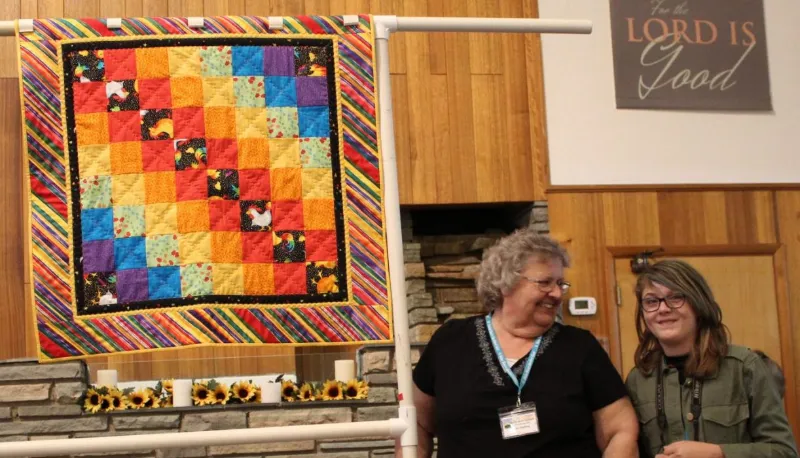 Sharon & Granddaughter Alyssa Koelling made Rainbow Roosters together. Sharon had about 600 4" squares to use up. Alyssa chose the rainbow fabrics to use with the rooster and chicken tracks squares. Sharon says "One should not put a baby on this side of the quilt if you want the child to sleep - the back side is for sleeping."